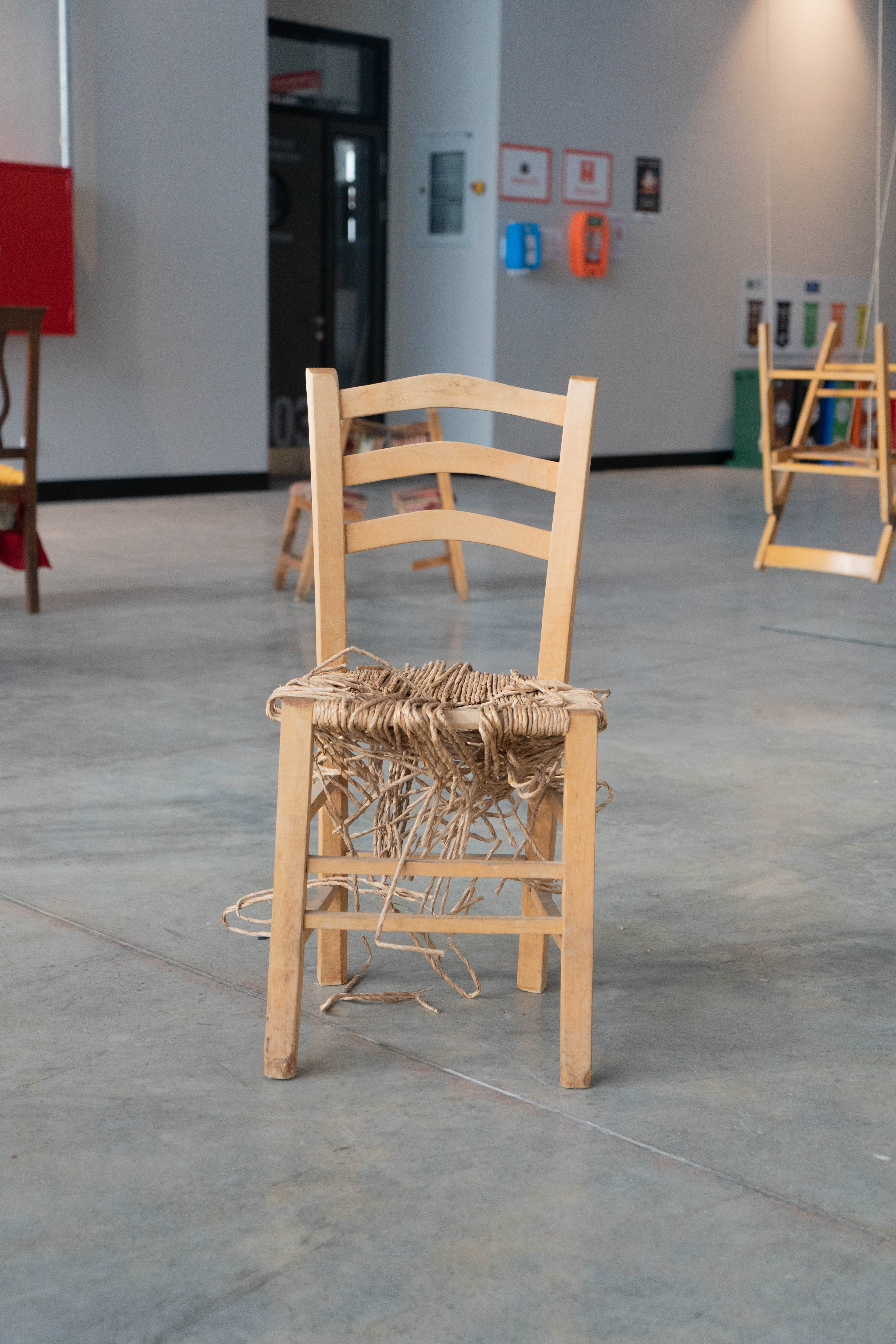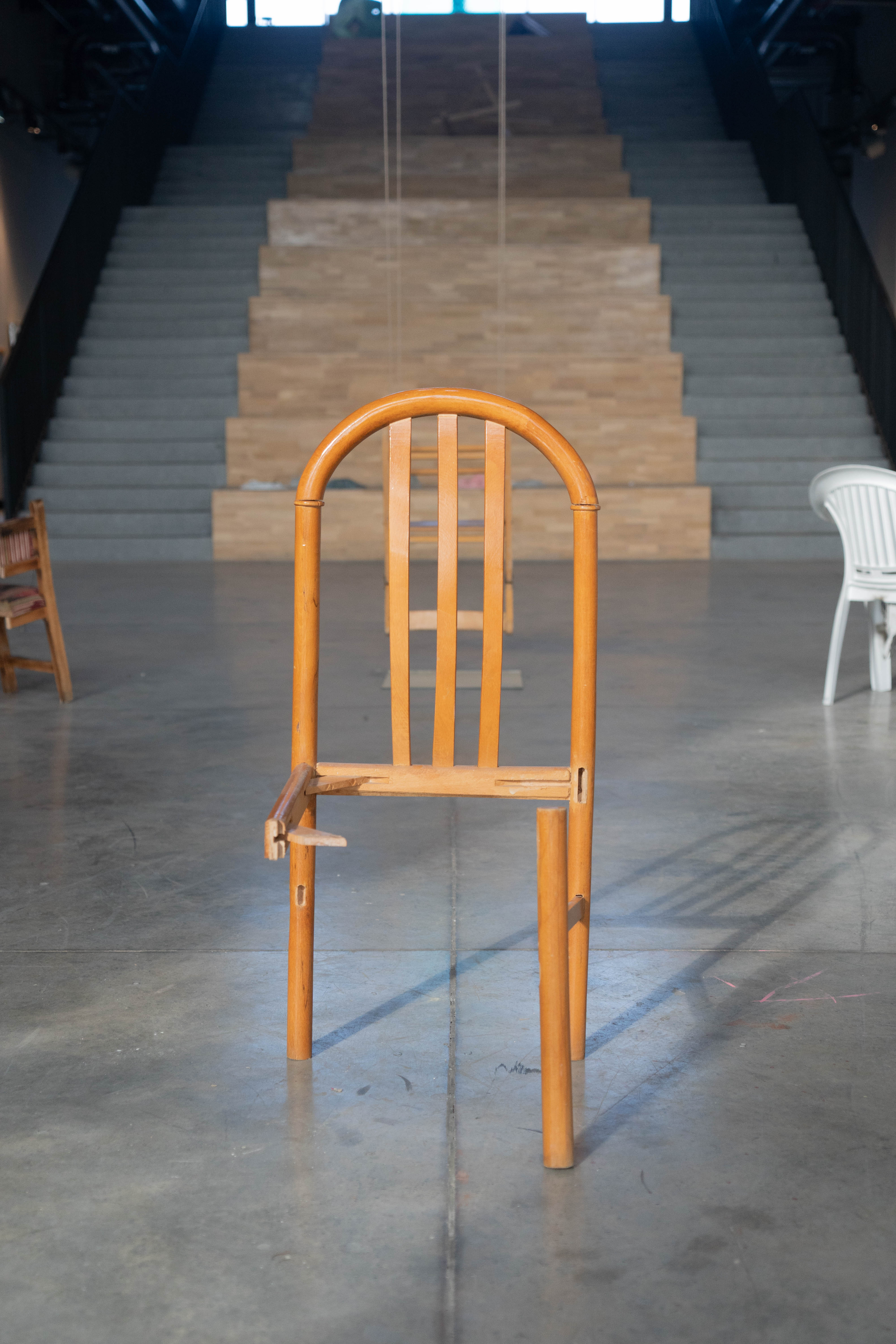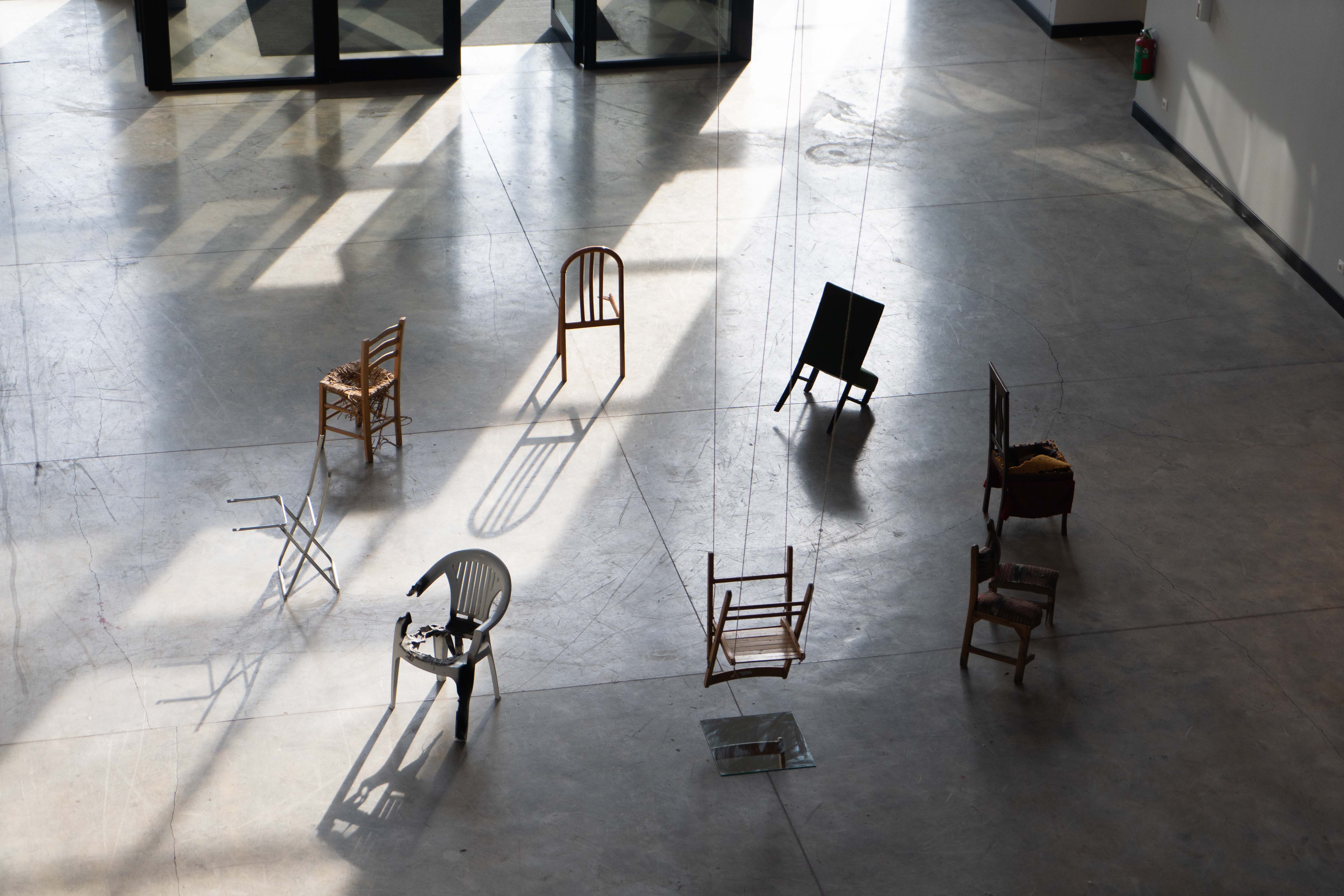 This work’s installation draws inspiration from the game “musical chairs” to address the concepts of localization, positioning, and earning a place for oneself. Chairs are subjected to operations that rob them of their functions; the process is repeated for every chair. Following this operation, the object in question now loses its old status and is brought to a new position. Humankind’s struggle to position themselves in society, a musical chairs game of one’s own, is played by the artwork’s observer.
