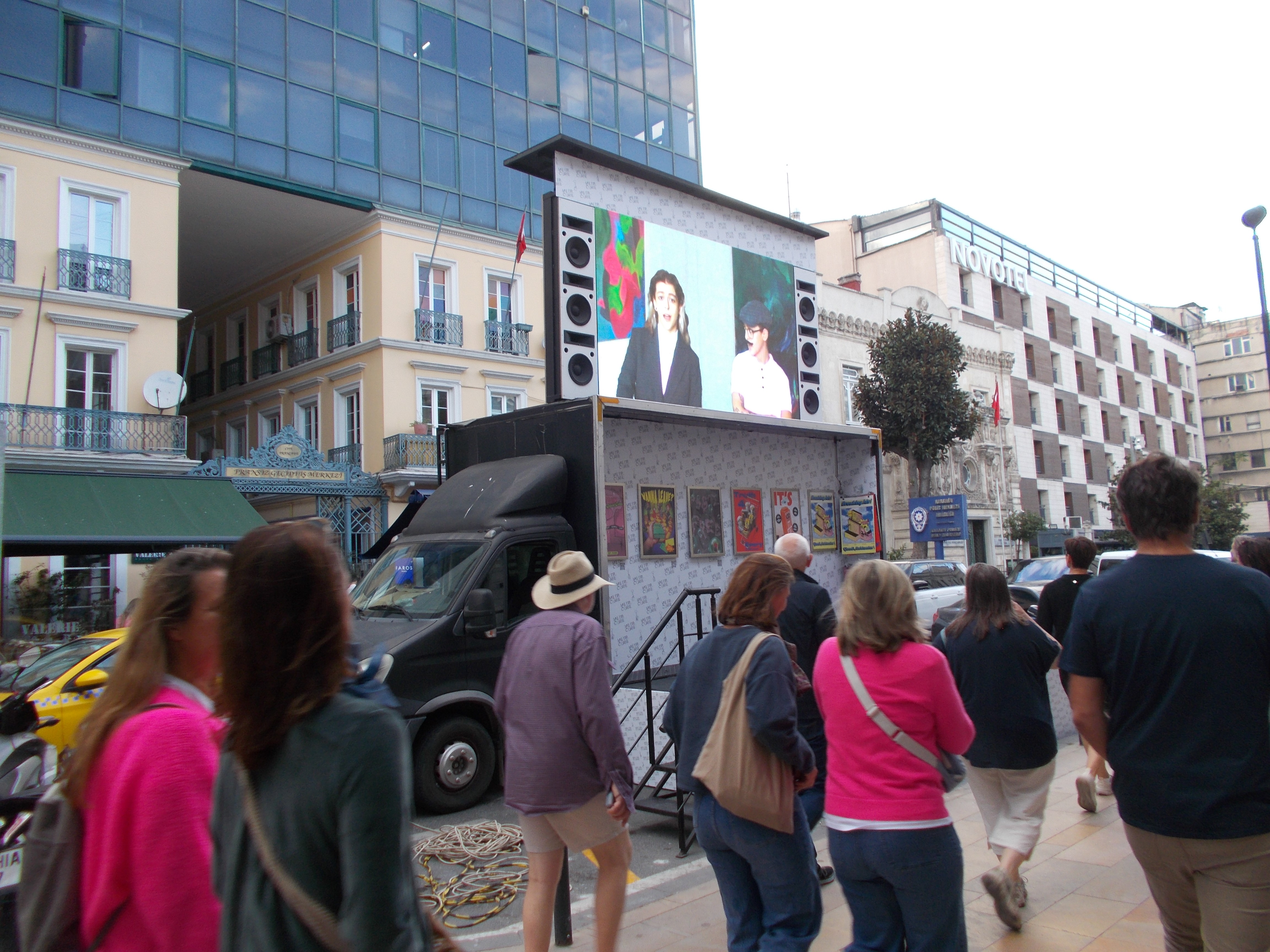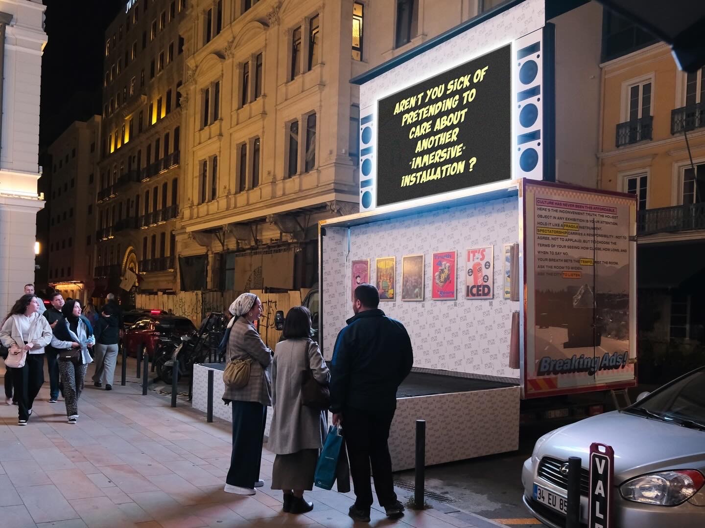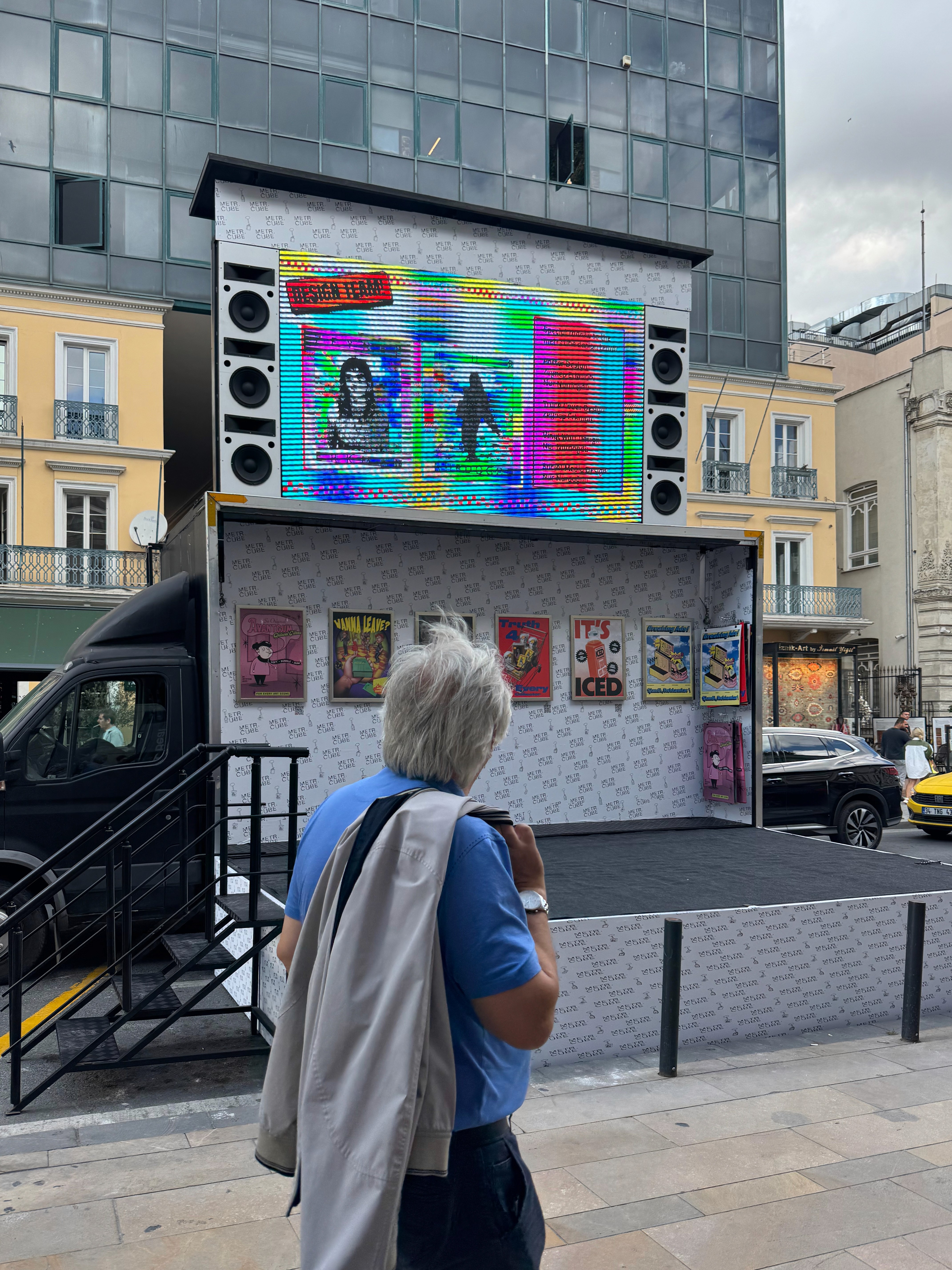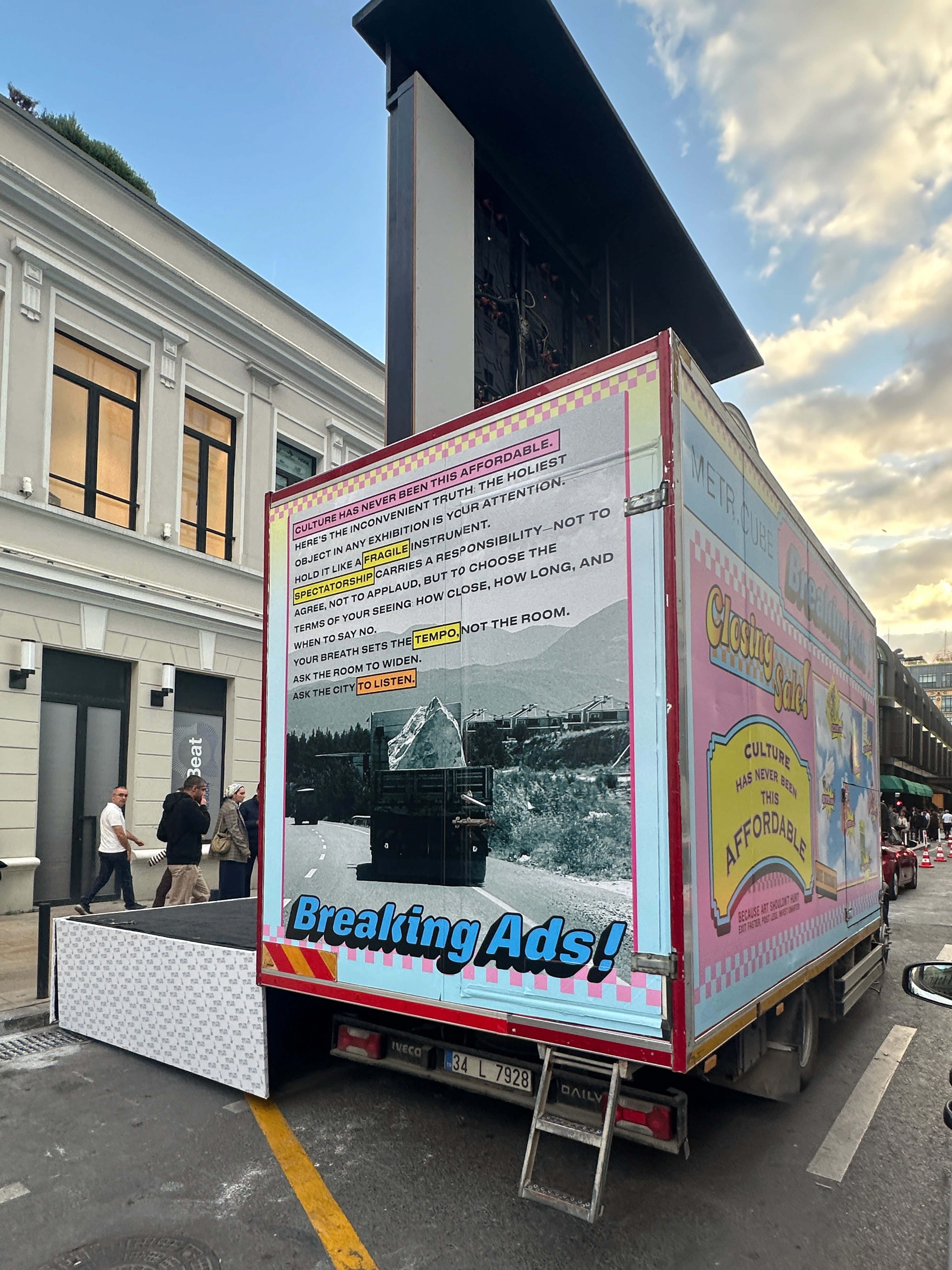 As a Parallel Event of the 18th Istanbul Biennial, metr.cube’s third exhibition, 3rd Cube: Breaking Ads!, took place on 27 September at Galataport Paket Postanesi. For one day, the metr.cube truck parked on site and converted its LED façades into an open-air advertising surface.